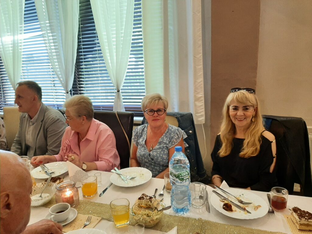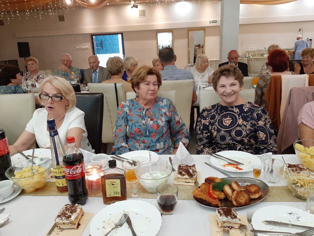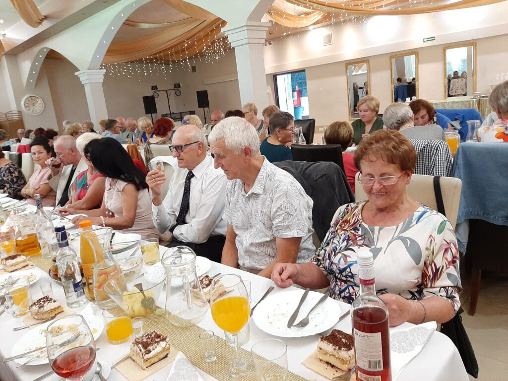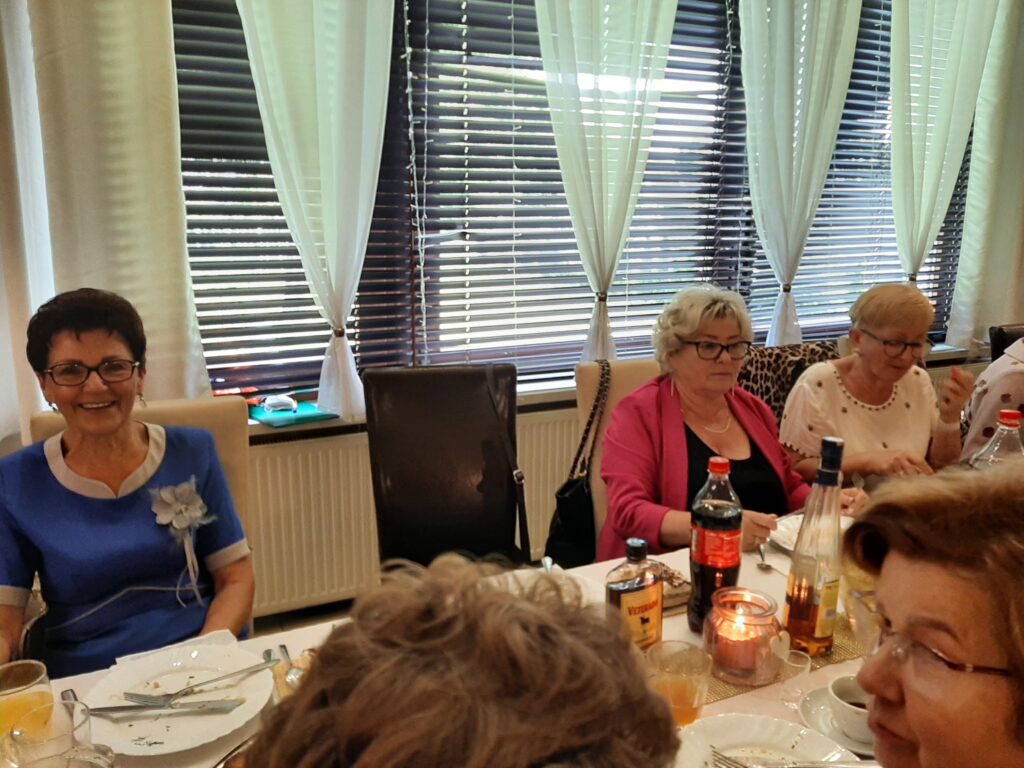 Panie w wyśmienitych strojach i fryzurach, panowie dostojni. Stoły zastawione suto przez obsługę Sali u Uli.Pięknie udekorowana sala sprawiała wrażenie miłego swojskiego miejsca, gdzie człowiek się dobrze czuje. Na wstępie przywitaliśmy Burmistrza Pana Michała Wiatra, który wkroczył na salę z ogromnym bukietem kwiatów z uśmiechem na ustach.Powiedział wiele miłych słów,obiecał pomoc w każdym zakresie. Złożył nam życzenia dalszych spotkań w tak miłym gronie. Z kolei prezes Basia Mucha, przywitała nas serdecznie,wspomniała kilka słów o realizowaniu planów przyjętych do końca wakacji. Wszyscy weseli,roześmiani i pełni nadziei,po spożyciu smacznego posiłku wyruszyliśmy na parkiet, gdzie dalej skutecznie bawił nas Pan Artur Konior.I tak dotrwaliśmy do zakończenia uroczystości.