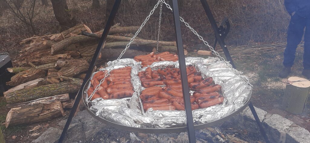 Wyruszyłyśmy na wiosenny spacer spod fontanny ścieżką nad jeziorem. Celem był piknik na świeżym powietrzu i różnorodne konkursy i zabawy. Na stole pojawiły się smakołyki-domowe ciasta, kawa, herbata, pieczone kiełbaski, kaszanka i kurczak.