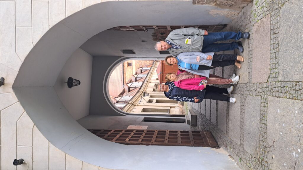 Dwugodzinny pobyt w basenie szybko upłynął, po krótkim odpoczynku i pysznej kawie z automatu grupa chętnych udała się na zwiedzanie zabytków, które mieliśmy w planie zwiedzania podczas tego pobytu. Pierwszym z nich był zabytkowy cmentarz żydowski w Świdwinie. Niestety obiekt uległ daleko posuniętej destrukcji, lecz doszliśmy do wniosku że warto było poznać jego historię. Drugim punktem naszego programu było zwiedzanie świdwińskiego zamku wewnątrz. Pan Adam oprowadził nas po średniowiecznym zamku rycerskim, którego historia sięga XIII wieku. Zamek został zbudowany na lewym brzegu rzeki Regi aby strzec szlaków handlowych. W zamku można zwiedzać komnaty krzyżackie, sale rycerskich narad oraz miejsce gdzie podejmowano decyzje o losach tych ziem.