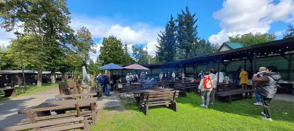 Miejscem naszego wspólnego spotkania był Campong „Hania” nad Jeziorem Miedwie w Morzyczynie. Nasi przyjaciele z UTW Stargard przywitali nas chlebem i solą. Były też oficjalne krótkie przemówienia i przekazanie upominków. Stoły zastawione przez gospodarzy uginały się od przeróżnych potraw, była gorąca grochówka, pieczone kiełbaski, kaszanki, ciasta i owoce.