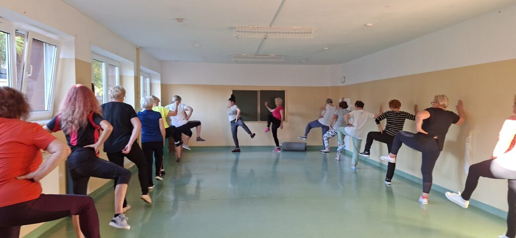 W przyjaznej atmosferze, pod czujnym okiem instruktora Pani Moniki Duraj, uczestniczki z zaangażowaniem wykonują kolejne zestawy ćwiczeń, dbając nie tylko o zdrowie, ale i dobre samopoczucie.