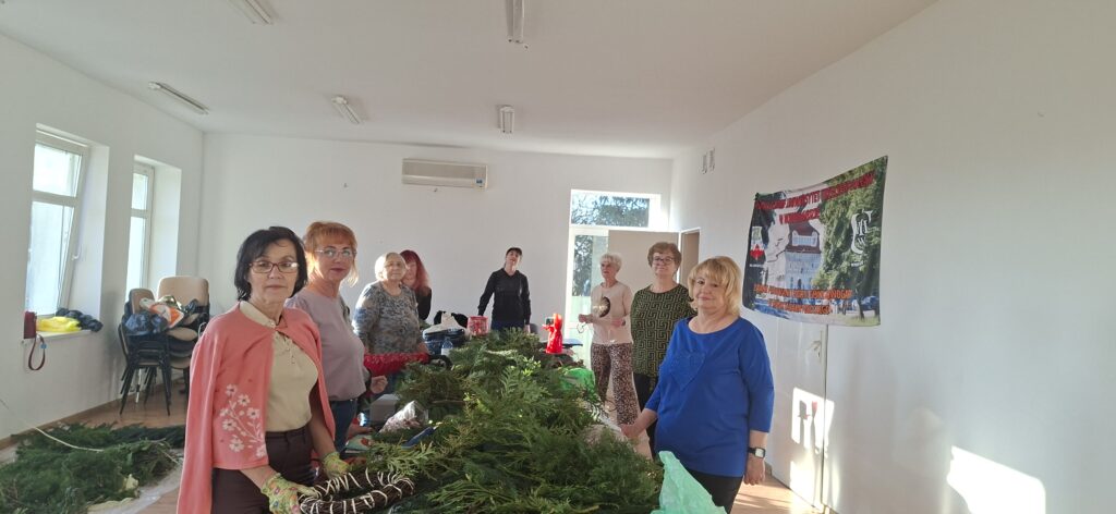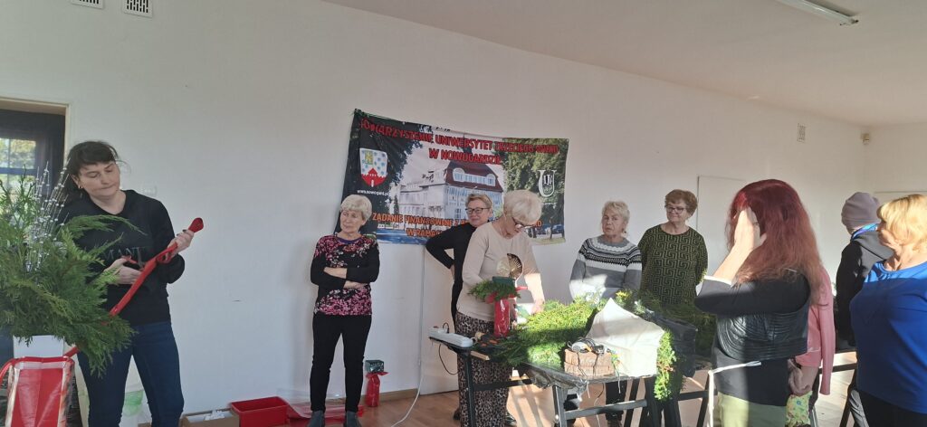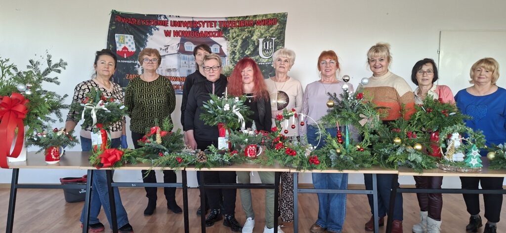 Dzisiaj 16.12.2025r podczas zajęć florystycznych seniorzy 60+ naszego Stowarzyszenia Uniwersytetu Trzeciego Wieku mieli okazję własnoręcznie tworzyć stroiki na święta Bożego Narodzenia. Uczestnicy z dużym zaangażowaniem dobierali gałązki – świerku, jodły, ozdoby i dodatki, tworząc niepowtarzalne kompozycje świąteczne.