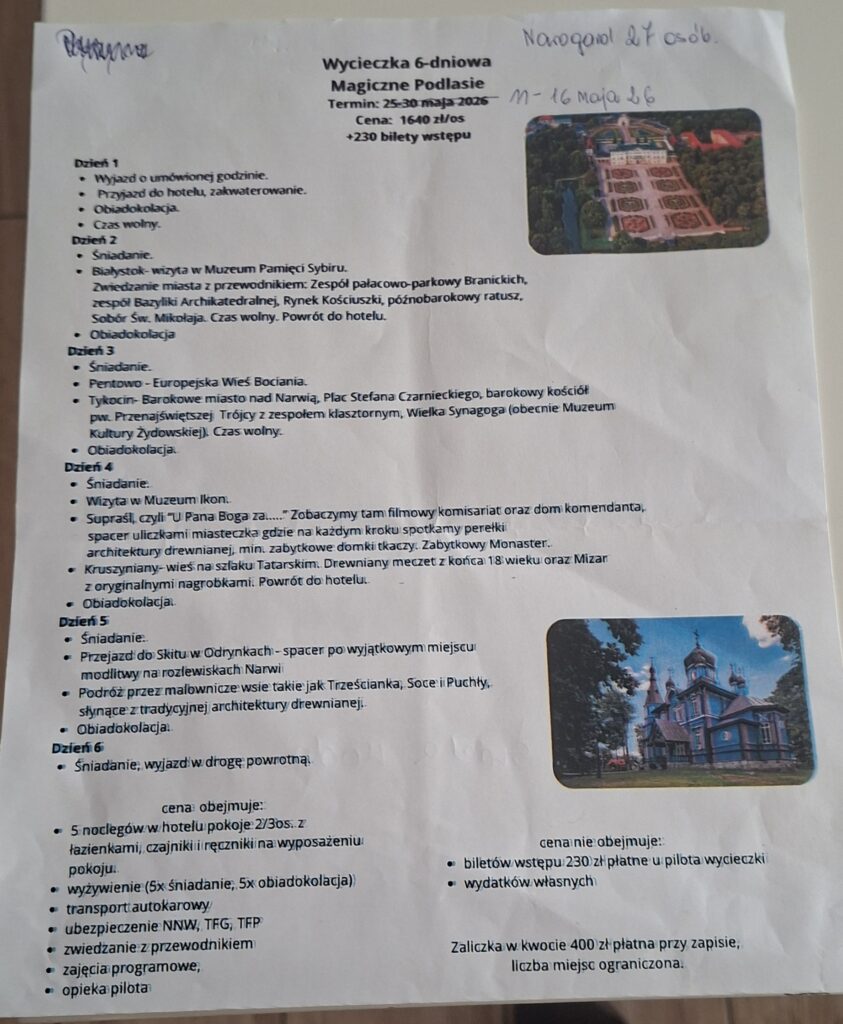 / Wycieczka 6-dniowa ,, Magiczne Podlasie”. Termin 11 -16 maj 2026r. cena: 1640zł + 230zł bilety wstępu. : Zaliczka :400zł płatna do 10 lutego 2026r w biurze lub na konto UTW.