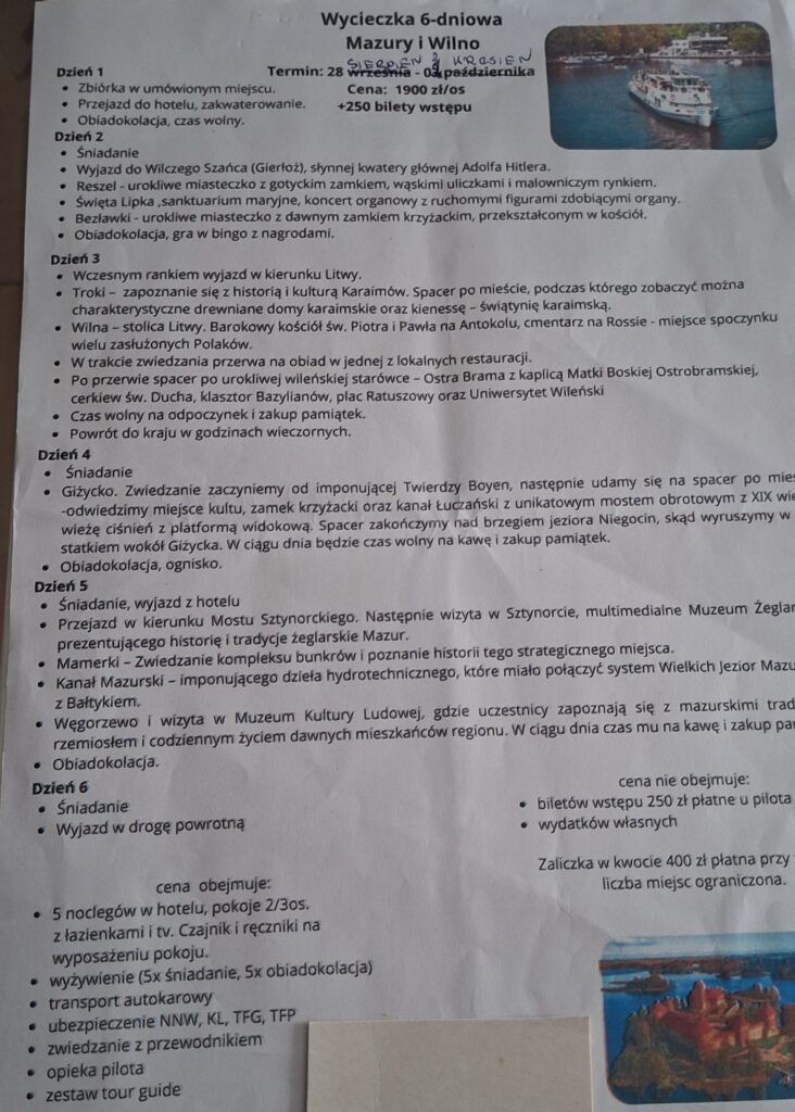 /Wycieczka 6-dniowa ,,Mazury i Wilno”. Termin 28 sierpień – 02 wrzesień 2026r. Cena : 1900zł+ 250zł bilety wstępu. Zaliczka 400zł płatna do końca lutego 2026r. w biurze UTW od 11.:00 do 13:00 lub na konto.
